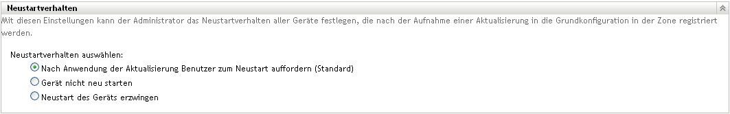 Nach Anwendung der Aktualisierung Benutzer zum Neustart auffordern (Standard): Nachdem die Aktualisierung angewendet wurde, wird sofort eine Aufforderung zum Neustart angezeigt. Wenn der Benutzer anfangs den Neustart verweigert, wird er so lange regelmäßig aufgefordert, das Gerät neu zu starten, bis das Gerät neu gestartet wird.