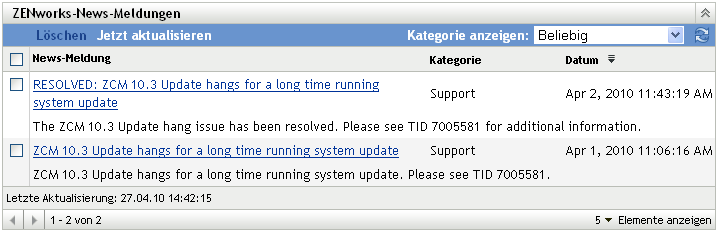 Die vom Primärserver zuletzt heruntergeladenen ZENworks-News-Aktualisierungen werden in der Kontrollleiste „ZENworks-News-Meldungen“ angezeigt. Dies kann einige Zeit dauern.