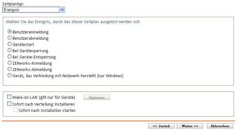 Mit dieser Option zur Erstellung eines Zeitplans können Sie das Ereignis angeben, das die eingeplante Aktion auslösen soll.