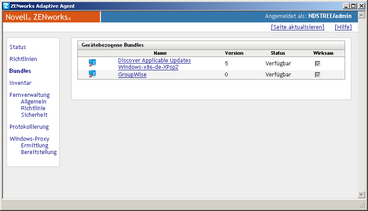 befindet sich im Windows-Benachrichtigungsbereich. Sie können auf das Symbol doppelklicken, um die Eigenschaften von ZENworks Adaptive Agent anzuzeigen. Über die Bundle-Verknüpfung im linken Navigationsbereich können Sie die Bundles anzeigen, die Ihnen und Ihrem Gerät zugewiesen sind.