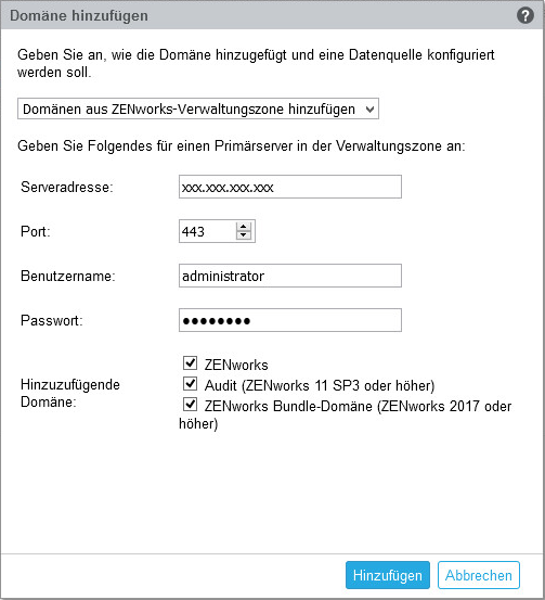 Wählen Sie Domänen von der ZENworks-Verwaltungszone hinzufügen und geben Sie Folgendes an: