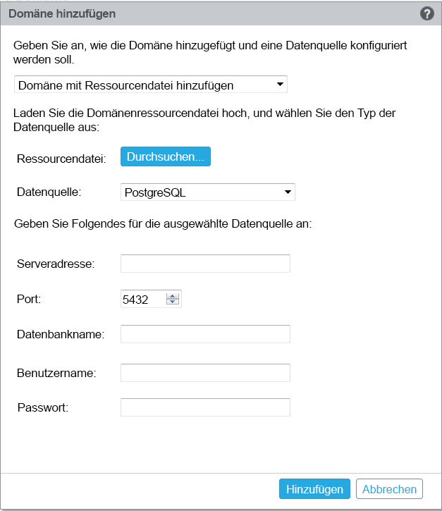 • Ressourcendatei (*.zip): Ziehen Sie die heruntergeladene und lokal verfügbare Domänenressourcendatei und legen Sie sie ab.