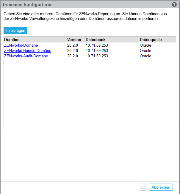 10. Geben Sie mindestens eine Domäne an, die Sie für ZENworks Reporting verwenden möchten. Sie können Domänen von der ZENworks-Verwaltungszone hinzufügen oder Domänenressourcendateien importieren.