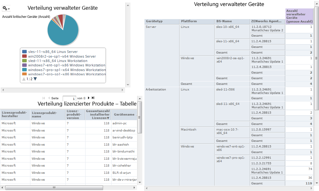 In einem ZENworks Reporting-Dashboard werden verschiedene Berichte als einzige, ganzheitliche Ansicht dargestellt. Die Dashboards werden mit vordefinierten Berichten oder mit Ad-hoc-Berichten erstellt. Diese Dashboards können weitere Dashboards umfassen, außerdem Eingabesteuerungen zum Festlegen der Daten, die in einem oder mehreren Frames angezeigt werden sollen, sowie benutzerdefinierte Frames, die auf URLs mit anderen Inhalten verweisen. Wenn Sie verschiedene Arten von ähnlichen Inhalten zusammenführen, entstehen aussagekräftige Dashboards mit großen Datenmengen. Zum Anzeigen, Erstellen und Bearbeiten von Dashboards benötigen Sie Administratorrechte.