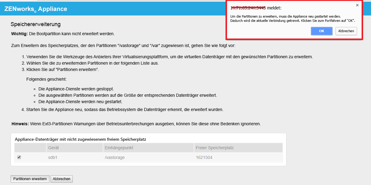 Klicken Sie auf „OK“ und starten Sie die Appliance neu, sodass das Betriebssystem die geänderte Volume-Größe erkennt.