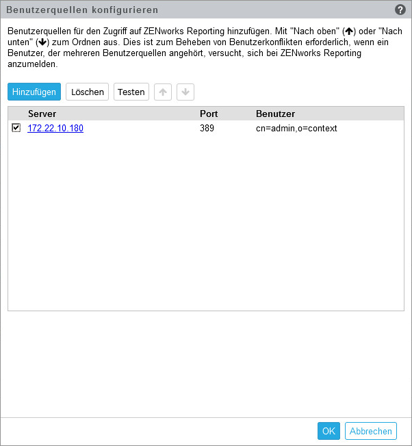 Löschen: Wählen Sie die Benutzerquelle des zu entfernenden Benutzers aus und klicken Sie auf Löschen. Wird eine Benutzerquelle gelöscht, können die Benutzer dieser Benutzerquelle nicht auf ZENworks Reporting zugreifen.