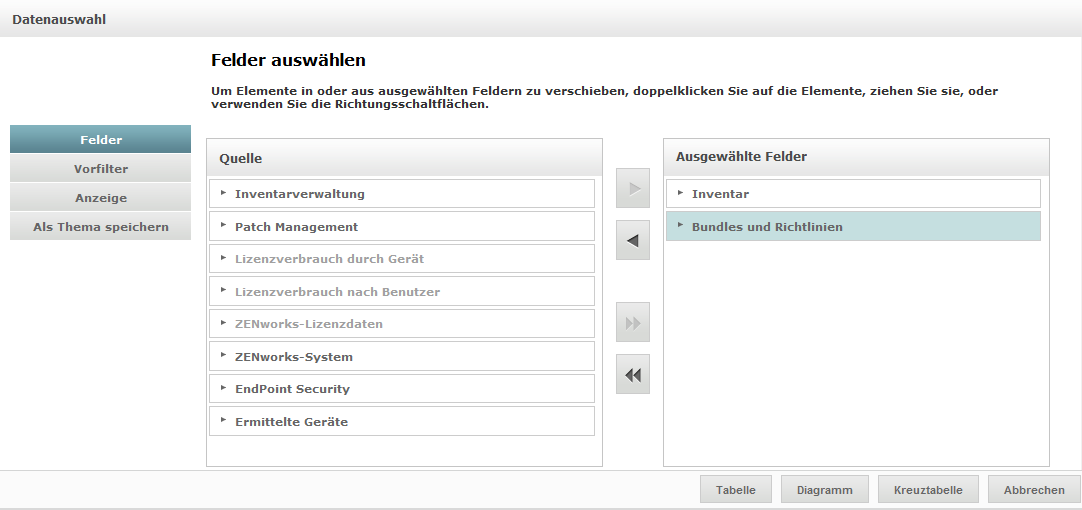 Der Bereich Ausgewählte Felder enthält die Elemente, die Sie im Bereich Quelle ausgewählt haben. Zum Verschieben eines Felds in einen anderen Bereich ziehen Sie die Elemente, doppelklicken Sie darauf oder wählen Sie die Elemente aus und klicken Sie auf eine Pfeiltaste.