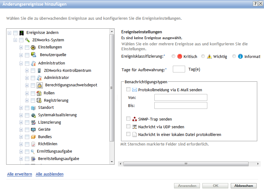 Weitere Informationen zu den Kategorien der Änderungs- und Agentenereignisse finden Sie im Handbuch ZENworks 11 SP3: Referenz für die Audit-Verwaltung.