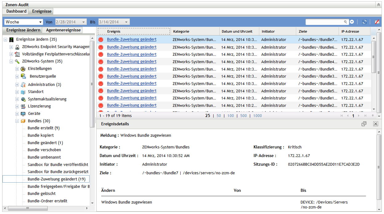 Ereignisse (Audit-Protokoll): Auf dieser Registerkarte wird eine Übersicht aller Ereignisse angezeigt, die in der Zone eingetreten sind. Die Informationen werden in einem ähnlichen Format wie auf der Seite „Ereigniskonfiguration“ dargestellt. Für Kategorien, in denen Ereignisse erzeugt wurde, wird die Anzahl dieser Ereignisse eingeblendet. Wenn beispielsweise ein Ereignis erzeugt wurde, ist neben der Kategorie „Bundle-Zuweisungsverwaltung“ in der Baumstruktur die Zahl sichtbar. Wenn Sie auf ein Ereignis klicken, werden die zugehörigen Details im rechten Bereich aufgelistet.