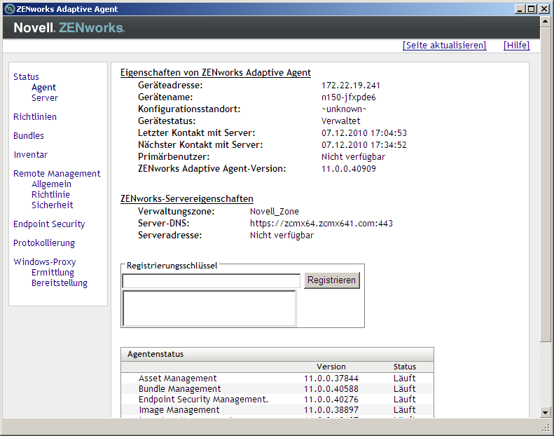 Status: Hier wird unter anderem der letzten Zeitpunkt angegeben, zu dem der Agent mit einem ZENworks-Server kommuniziert hat, oder ob die Agentenfunktionen ausgeführt werden.