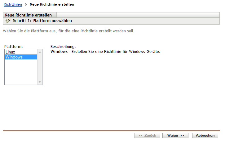 Wählen Sie auf der Seite „Richtlinientyp auswählen“ den zu erstellenden Richtlinientyp aus und klicken Sie anschließend auf .