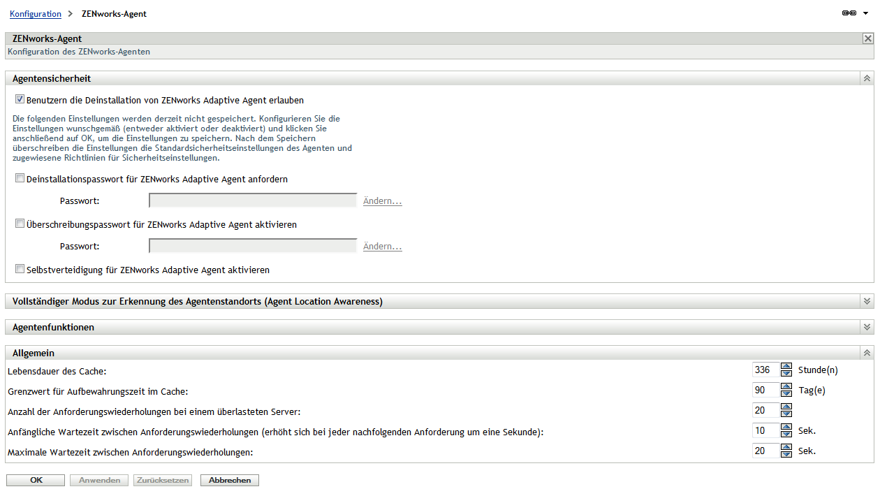 Um den ZENworks Adaptive Agent auf Geräten zu sichern, können Sie sowohl dessen Einstellungen für die Deinstallation als auch für die Selbstverteidigung konfigurieren.