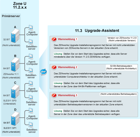 Wenn das Aufrüstungsinstallationsprogramm nicht unterstützte Betriebssysteme meldet, rüsten Sie die Betriebssysteme auf eine unterstützte Version auf. Wenn OES auf mindestens einem Primärserver ausgeführt wird, können Sie den Primärserver mit dem ZENworks 11 SP3-Servermigrationsprogramm auf ein unterstütztes Betriebssystem migrieren.