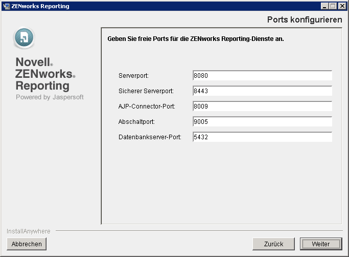 Das Installationsprogramm fordert Sie auf, die Ports für ZENworks Reporting anzugeben. Die Standardwerte für die Ports werden angezeigt und können geändert werden.