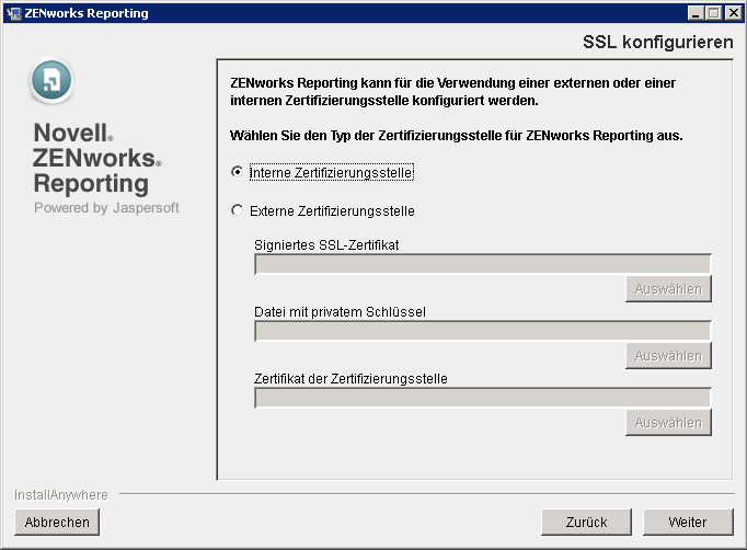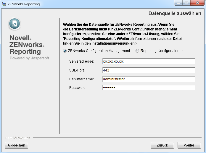 Dies kann auf dem Server, auf dem Sie ZENworks Reporting installiert haben, oder auf einer qualifizierten Arbeitsstation geschehen.