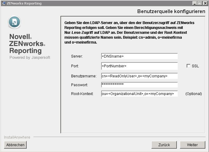 Das Installationsprogramm fordert Sie auf, die LDAP-Verbindungsdetails (Lightweight Directory Access Protocol) anzugeben. In diesem Bereich müssen Sie eine Benutzerquelle konfigurieren, um die LDAP-Serververbindung über ZENworks Reporting zu authentifizieren.
