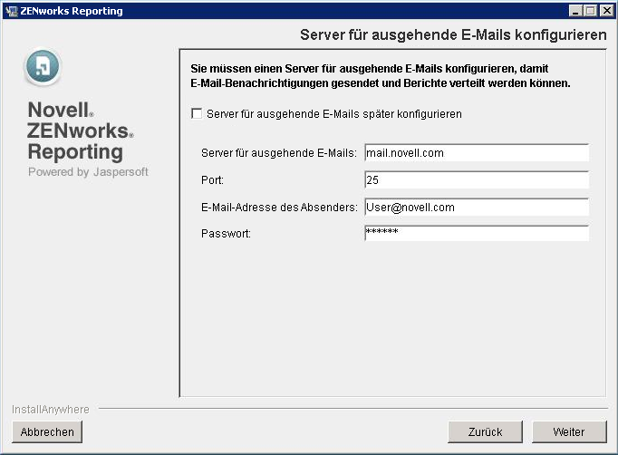 Das Installationsprogramm fordert Sie auf, den Server für ausgehende E-Mails zu konfigurieren. Diese Konfiguration ist erforderlich, damit die Email-Benachrichtigungsfunktion für Report Scheduling aktiviert werden kann.