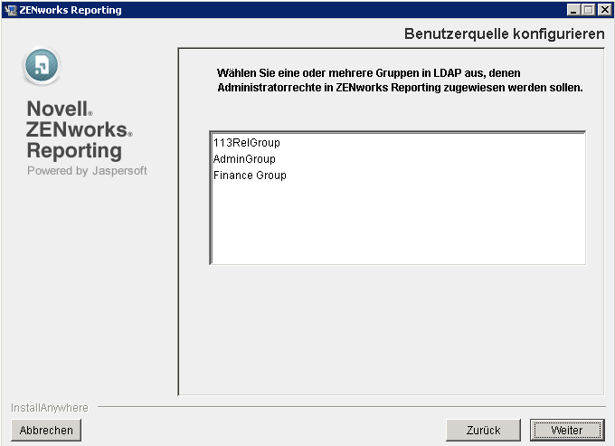 3. Wählen Sie die LDAP-Gruppen aus, die der Rolle ADMINISTRATOR_ROLE zugeordnet werden sollen. Diese Kontrollleiste zeigt die LDAP-Gruppen, die sich gemäß dem in der engeren Auswahl befinden. Wählen Sie mindestens eine Benutzergruppe in dieser Liste aus, die der Rolle ROLE_ADMINISTRATOR zugeordnet werden soll. Wenn Sie eine übergeordnete Gruppe (also eine Gruppe, die weitere Untergruppen enthält) für die Zuordnung zur Administratorrolle auswählen, werden die Untergruppen in dieser übergeordneten Gruppe nicht zur Administratorrolle zugeordnet. Sollen Untergruppen zur Administratorrolle zugeordnet werden, müssen Sie diese Untergruppen einzeln auswählen. Die Gruppe „Finanzen“ enthält beispielsweise mehrere Untergruppen (finanzen_konto, finanzen_einkauf, finanzen_verwaltung) und einen Benutzer (finanzen_manager). Wenn Sie die Gruppe für die Zuordnung zur Administratorrolle auswählen, erhält nur der Benutzer „finanzen_manager“ die Administratorrechte. Die Rechte werden nicht an die Benutzer in den verschachtelten Untergruppen weitergegeben. Sollen auch die Benutzer in den Untergruppen die Administratorrechte erhalten, wählen Sie diese Gruppen (finanzen_konto, finanzen_einkauf, finanzen_verwaltung) ebenfalls aus, sodass sie ebenfalls zur Administratorrolle zugeordnet werden. 4. Klicken Sie auf . Konfigurieren mehrerer Benutzerquellen ZENworks Reporting 5 unterstützt nur eine einzige Benutzerquelle. Mit dem ZENworks Reporting-LDAP-Dienstprogramm können Sie diese Einschränkung umgehen. Mit diesem Dienstprogramm können Sie eine weitere Benutzerquelle hinzufügen und zu den erforderlichen Gruppen für die ZENworks Reporting-Administratorrolle in ZENworks Reporting zuordnen. Dieses Dienstprogramm müssen Sie auf Ihrem vorhandenen ZENworks Reporting-Server ausführen. Sie werden aufgefordert, eine weitere LDAP-Quelle separat zu konfiguieren und die LDAP-Gruppen, die zur Administratorrolle auf demselben Server zugeordnet werden sollen, manuell einzugeben. Soll eine Gruppe zu einer anderen Benutzerquelle zugeordnet werden, führen Sie das ZENworks Reporting-LDAP-Dienstprogramm erneut aus. Weitere Informationen zum ZENworks Reporting-LDAP-Dienstprogramm finden Sie im Artikel TID 7014511 in der Novell Support-Knowledgebase. WICHTIG:Führen Sie das ZENworks Reporting-LDAP-Dienstprogramm nach Abschluss der Installation aus. |
