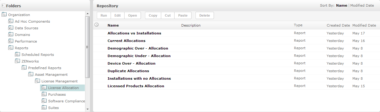 Das Repository ist der interne Serverspeicher für Berichte, Analyseansichten und zugehörige Dateien. Das Repository ist als Ordnerstruktur aufgebaut und enthält verschiedene Ressourcen, wie z. B. ein Dateisystem. Im Gegensatz zu einem Dateisystem wird das Repository allerdings als private Datenbank gespeichert, auf das nur ZENworks Reporting direkt zugreifen kann.