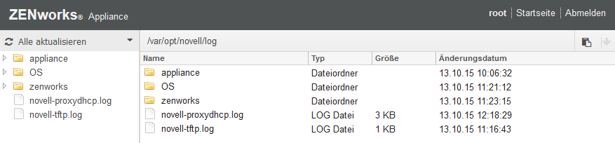Diese Option ermöglicht es Ihnen, Protokolle des ZENworks-Primärservers anzuzeigen. Die Protokolle sind nach Appliance-Protokollen, Betriebssystemprotokollen und ZENworks-Protokollen kategorisiert. In ZENworks werden die Protokolle nach verschiedenen ZENworks-Komponenten gegliedert.