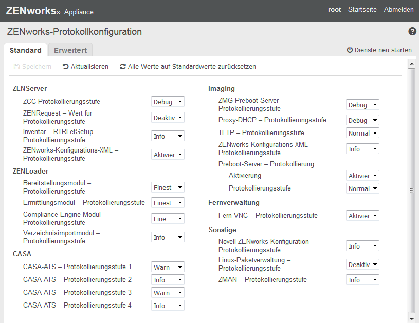 Dies ermöglicht es Ihnen, ZENworks betreffende Protokollkonfigurationsdateien (wie ZENServer, ZENLoader, Eingebettete Datenbank, ZMAN, CASA, Inventar, Imaging und Fernverwaltung) anzuzeigen, zu konfigurieren oder zu bearbeiten.