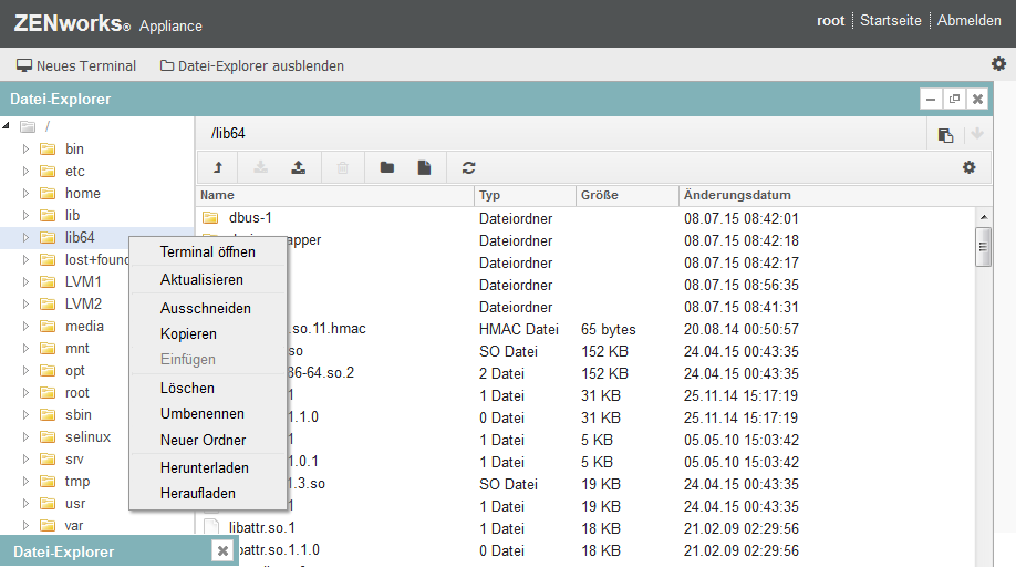 Im Datei-Explorer können Sie die Appliance-Vorgänge zu (SLES-Unix-)Dateisystem, Miniaturansicht-Navigation, Hochladen, Herunterladen, Aktualisieren, Umbenennen, Erstellen oder Löschen sowie Ausschneiden, Kopieren und Einfügen durchführen.