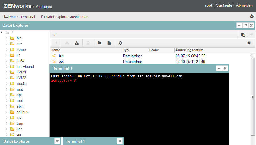 Wenn Sie sich als zenadmin- oder root-Benutzer anmelden, können Sie eine Terminal-Sitzung öffnen. Der zenadmin-Benutzer kann ZENworks-Befehle wie zman, zac und novell-zenworks-configure ausführen.