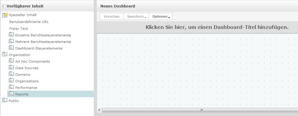 Navigieren Sie im Bereich Verfügbarer Inhalt zum gewünschten Ordner, klicken Sie mit der rechten Maustaste auf den Berichtsnamen, und klicken Sie auf Add to Dashboard (Zu Dashboard hinzufügen), oder ziehen Sie den Bericht per Drag & Drop aus dem Bereich Verfügbare Inhalte in den Dashboard Viewer (Dashboard-Viewer).