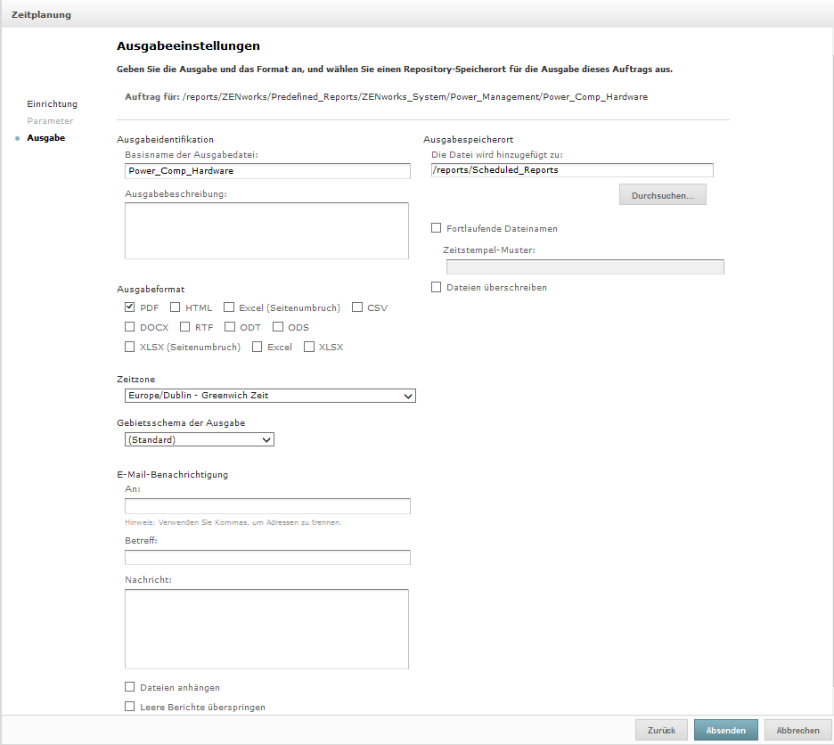 • Dateien anhängen: Die Berichtausgabe wird zusammen mit der Email-Benachrichtigung gesendet.