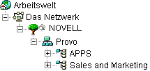 Wenn Ihr eDirectory-Baum nur einen Standort umfasst, können Sie Anwendungsobjekte in jedem Container platzieren. Wenn Sie beispielsweise einen kleinen Standort haben, der aus ein oder zwei Organisationen besteht, können Sie einen gemeinsamen APPS-Container erstellen.