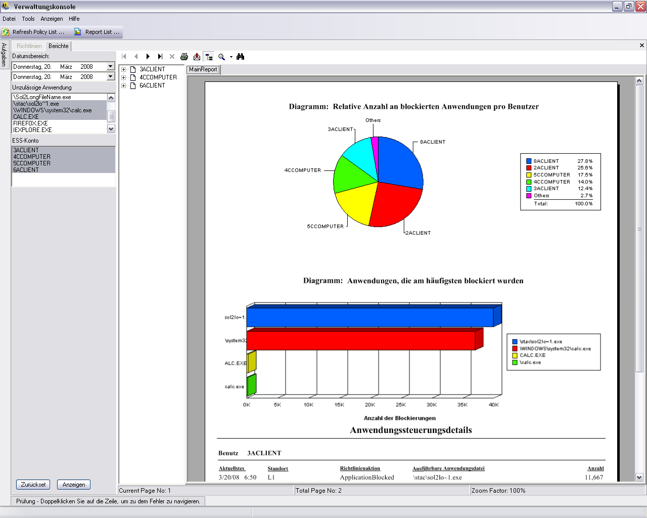 In Berichten über Anwendungssteuerung werden sämtliche unbefugten Versuche blockierter Anwendungen, auf das Netzwerk zuzugreifen bzw. zur Ausführung zu gelangen, obwohl dies durch die Richtlinie untersagt ist, angezeigt.