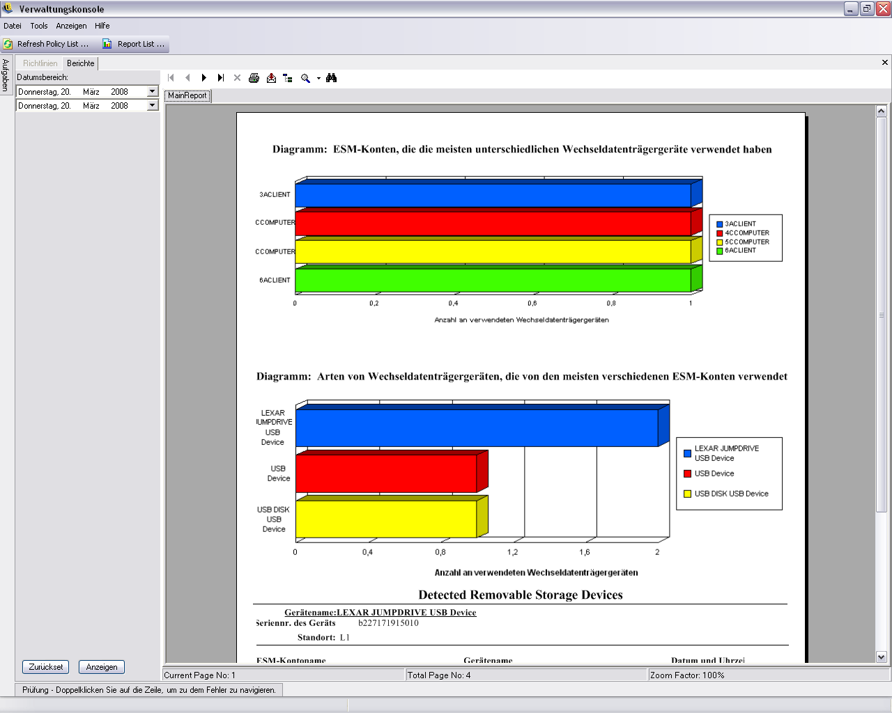 Detected Removable Storage Devices: Zeigt Wechseldatenträger, die am Endpunkt erkannt wurden. Wählen Sie Datumsbereich, Benutzernamen und Standorte aus, um diesen Bericht zu generieren.