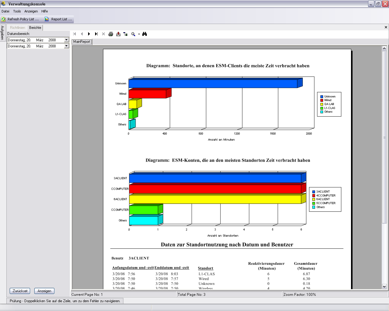 Daten zur Standortnutzung nach Datum und Benutzer: Stellt von individuellen Clients erfasste Daten über die verwendeten Standorte und den jeweiligen Zeitpunkt der Verwendung bereit. Datumsangaben werden in UTC (Universal Coordinated Time) angezeigt. Bei den angezeigten Standorten handelt es sich um von dem Benutzer genutzte Standorte; nicht genutzte Standorte werden nicht angezeigt. Wählen Sie einen Datumsbereich aus, um den Bericht zu generieren.