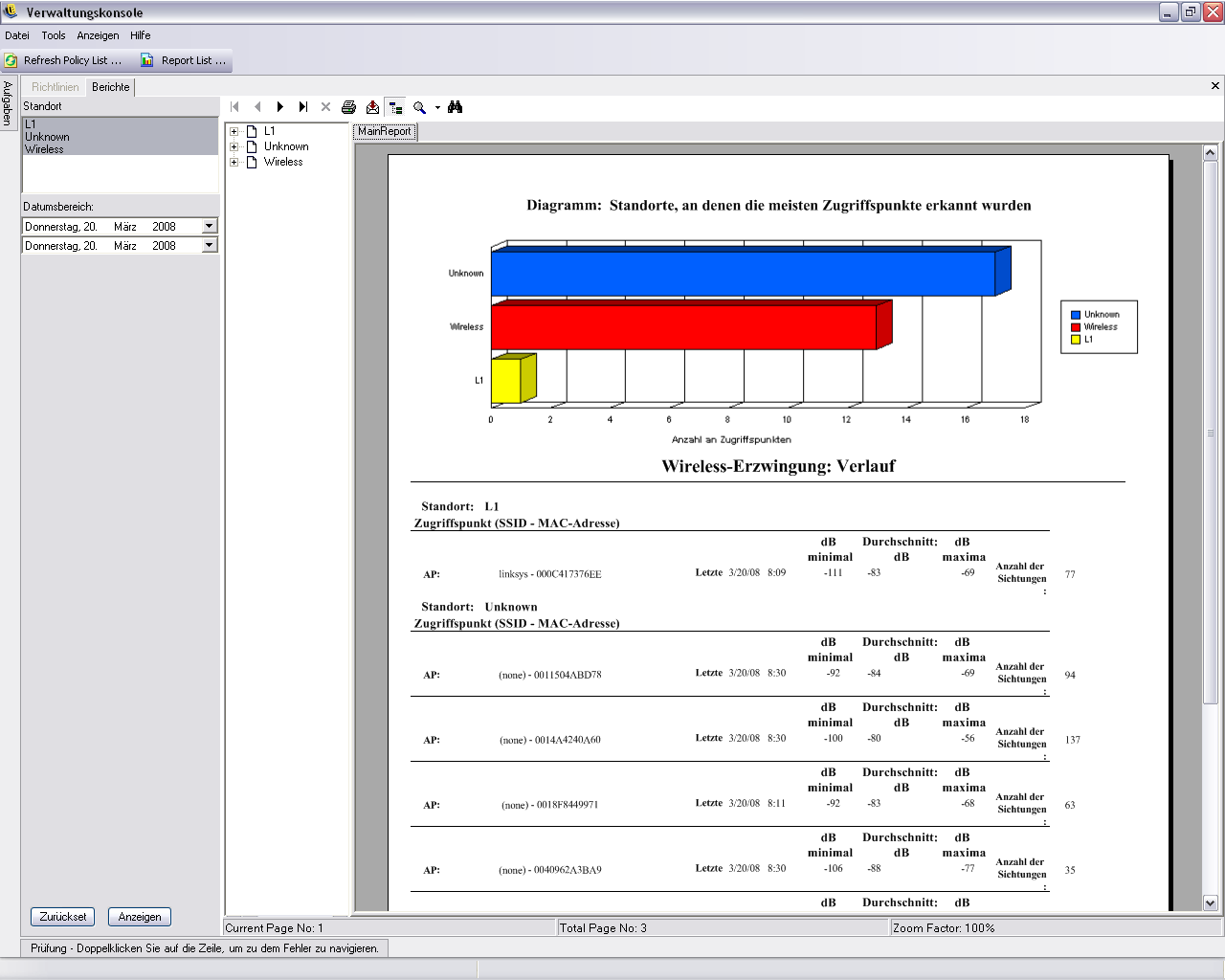 Wireless Connection Availability: Zeigt die Zugriffspunkte, die für Verbindungen zur Verfügung stehen, nach Richtlinie und Standort. Umfasst Kanal, SSID, MAC-Adresse sowie Angaben dazu, ob der Zugriffspunkt verschlüsselt ist.