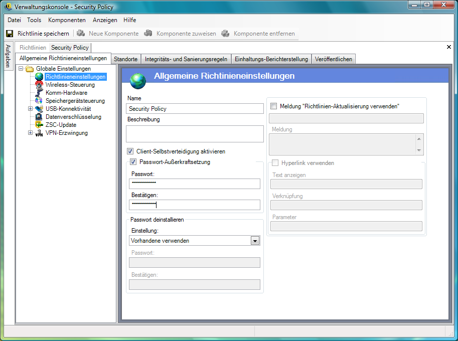 Passwort deinstallieren: Es empfiehlt sich, jede ZENworks* Security Client-Instanz mit einem Deinstallationspasswort zu installieren, um Benutzer daran zu hindern, die Software zu deinstallieren. Dieses Passwort wird normalerweise zum Installationszeitpunkt konfiguriert, das Passwort kann jedoch per Richtlinie aktualisiert, aktiviert bzw. deaktiviert werden.
