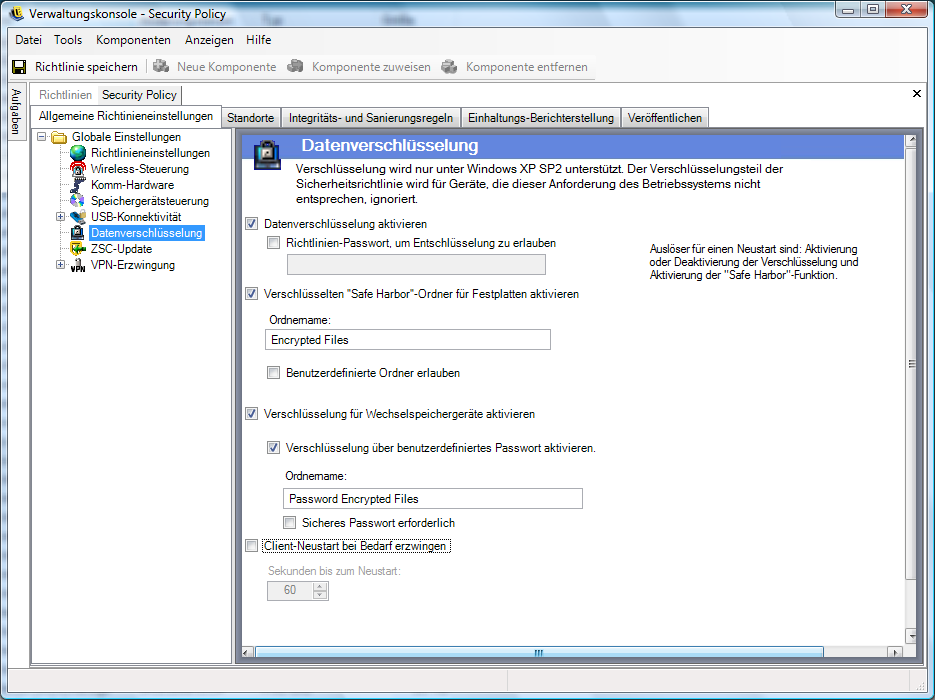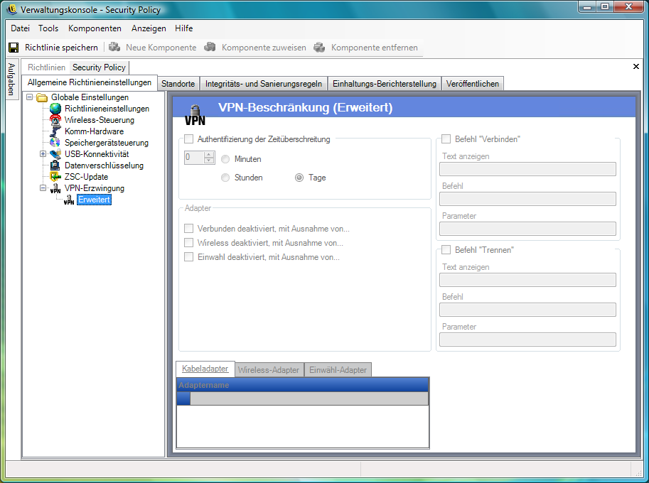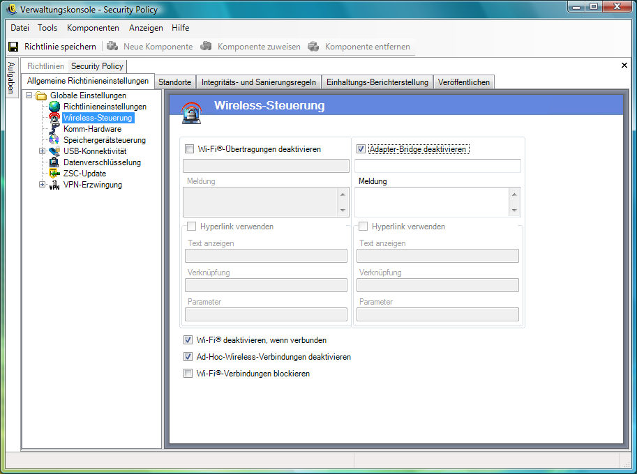 Mit "Wireless-Steuerung" werden Parameter für die Adapterkonnektivität global festgelegt, um sowohl den Endpunkt als auch das Netzwerk zu schützen. Für den Zugriff auf dieses Steuerelement wechseln Sie zur Registerkarte und klicken Sie im Richtlinienbaum auf der linken Seite auf das Symbol .