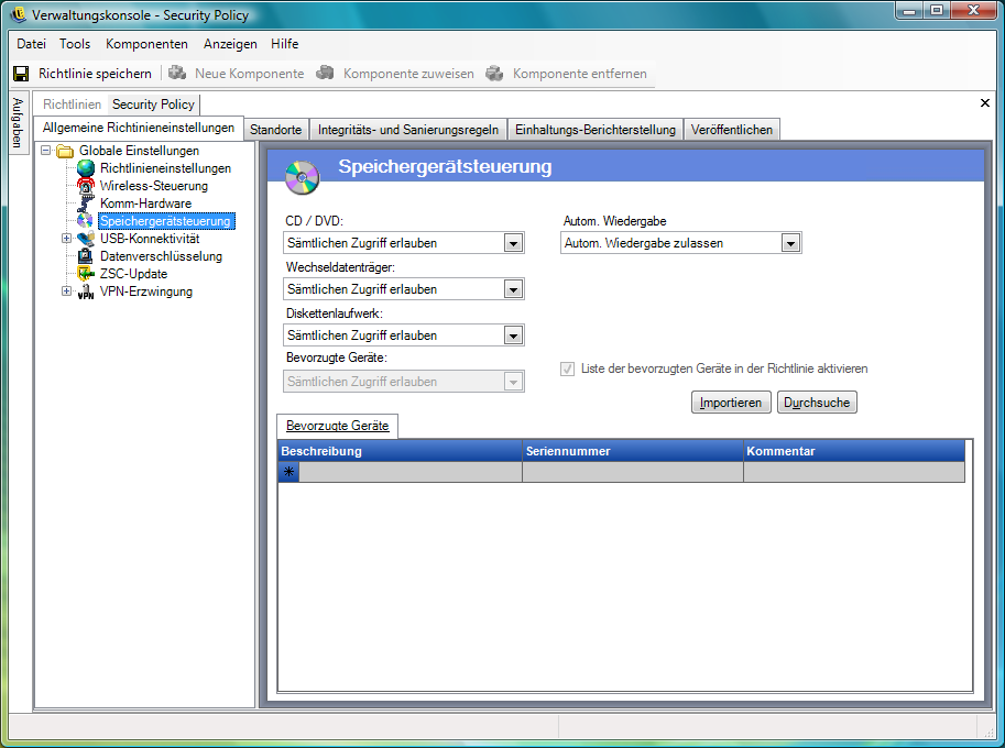 Bevorzugte Wechselspeichergeräte können optional in eine Liste aufgenommen werden, um nur autorisierten Geräten den Zugriff zu erlauben, wenn die globale Einstellung an einem Standort verwendet wird. In diese Liste aufgenommene Geräte müssen·eine Seriennummer aufweisen.