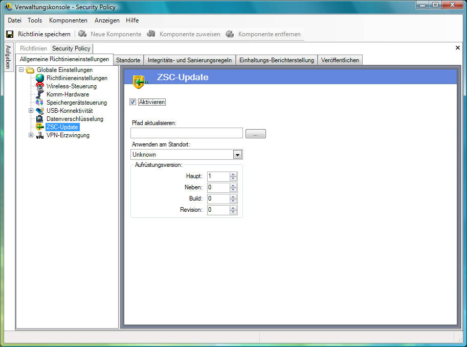 Die Komponenten werden entweder in einer "Dummy"-Richtlinie erstellt, oder es werden von anderen Komponenten aus Verknüpfungsvorgänge durchgeführt. Bei den ersten paar Richtlinien wird davon ausgegangen, dass Sie sämtliche eindeutigen Standorte, Firewall-Einstellungen und Integritätsregeln für das Unternehmen definieren. Diese Komponenten werden für die etwaige spätere Verwendung in anderen Richtlinien in der Datenbank des Verwaltungsdienst gespeichert.