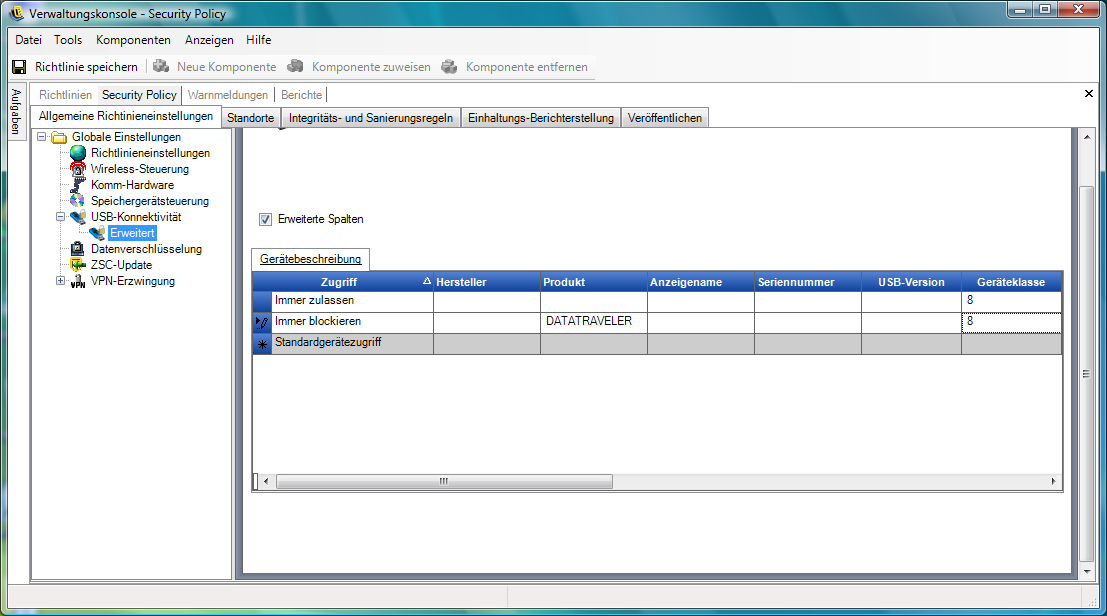 In den meisten Situationen reichen die vier auf der Seite "USB-Konnektivität" aufgelisteten Gerätegrupen (HID, Massenspeicherklasse, Druckklasse und Scanning/Imaging), um den meisten USB-Geräten den Zugriff zu erlauben oder zu verweigern. Bei Geräten, die nicht in einer dieser Gruppen registriert sind, können Sie die Einstellungen auf der Seite "USB-Konnektivität – Erweitert" konfigurieren. Sie können auch die Einstellungen auf der Seite "Erweitert" verwenden, um Whitelist-Zugriff auf bestimmte Geräte zu erlauben, auch wenn ihnen bereits aufgrund der Einstellungen auf der Seite "USB-Konnektivität" der Zugriff verweigert wurde.