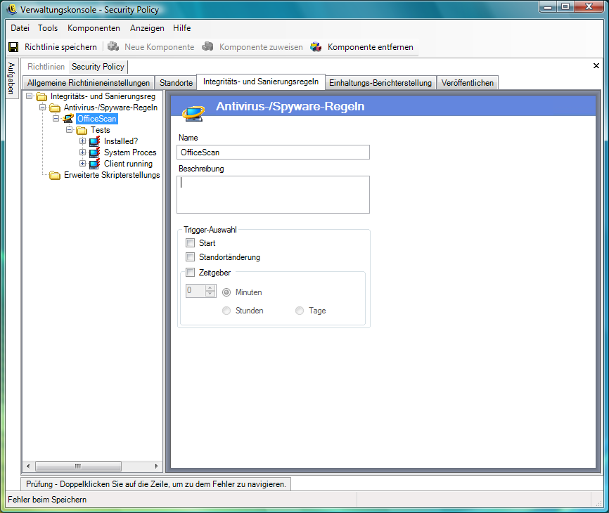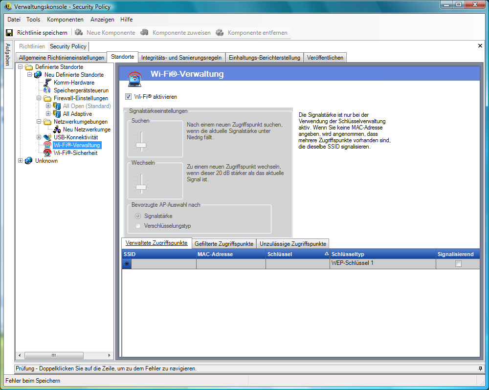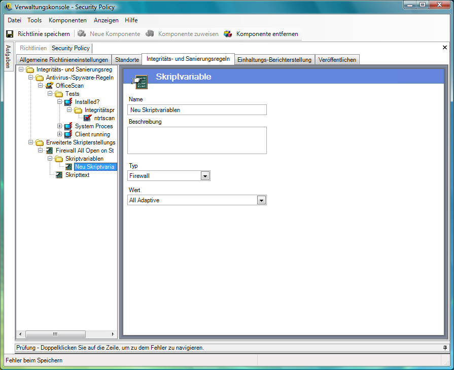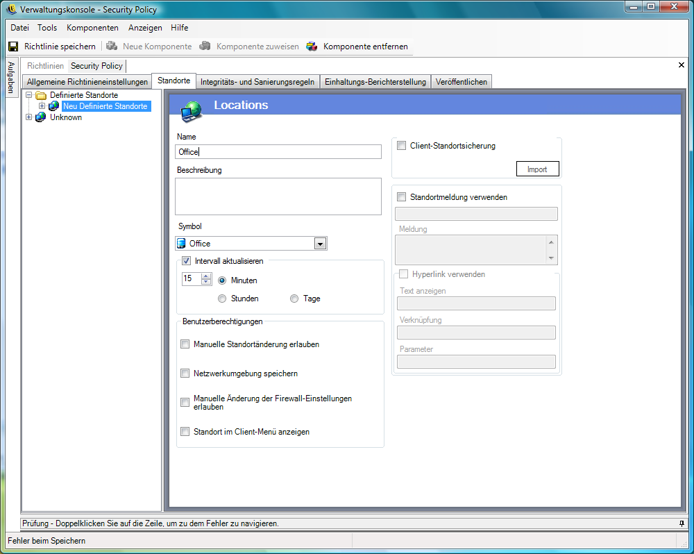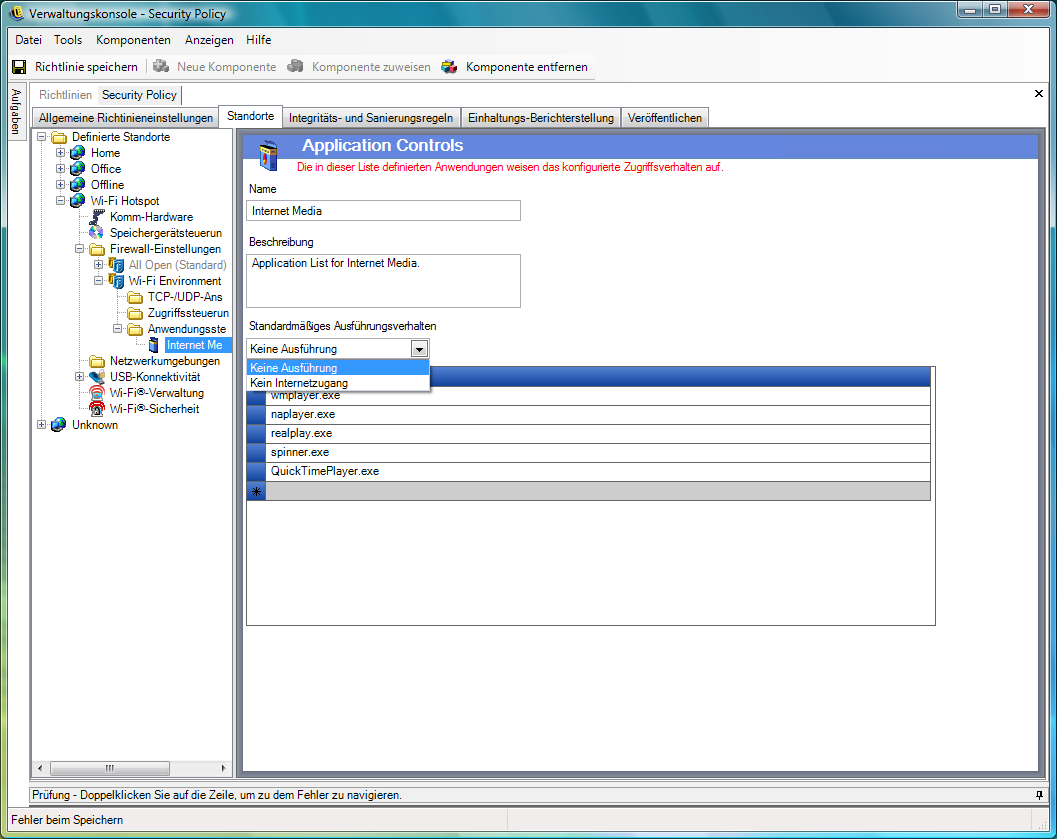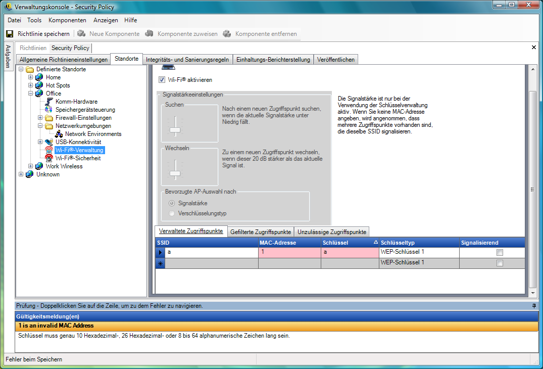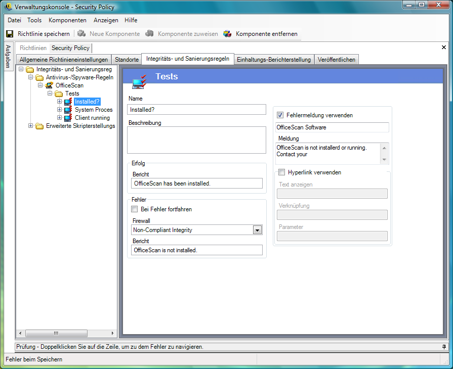 Wenn der Administrator versucht, eine Richtlinie mit unvollständigen oder falschen Daten in einer Komponente zu speichern, wird der Bestätigungsbereich am unteren Rand der Verwaltungskonsole angezeigt, in dem die einzelnen Fehler hervorgehoben sind. Sämtliche Fehler müssen·korrigiert werden, bevor die Richtlinie gespeichert werden kann.