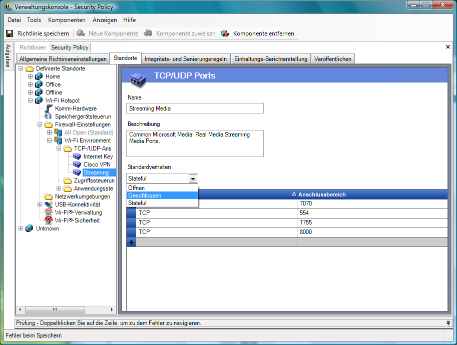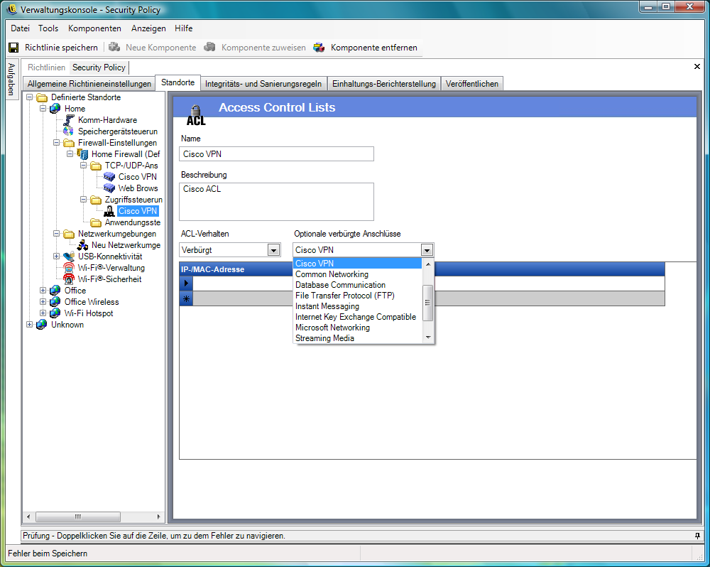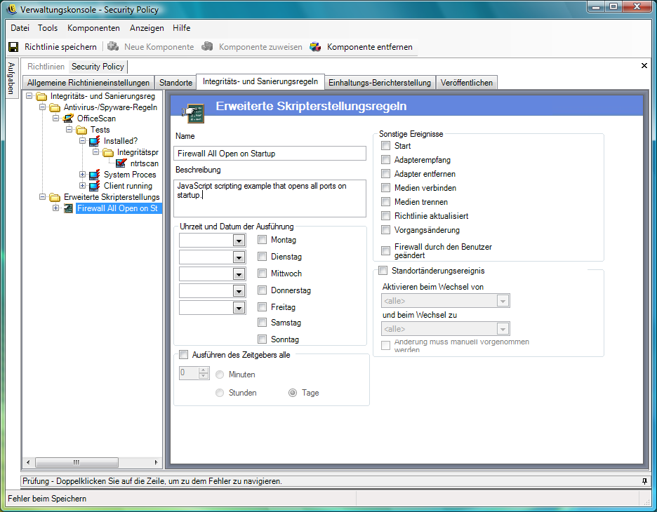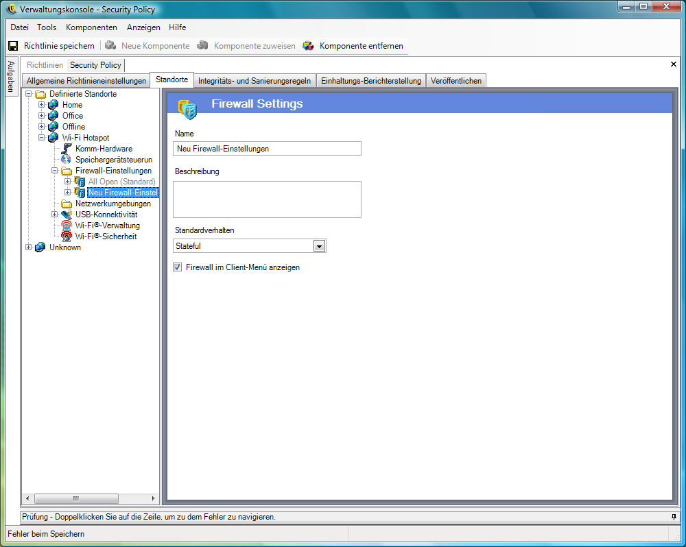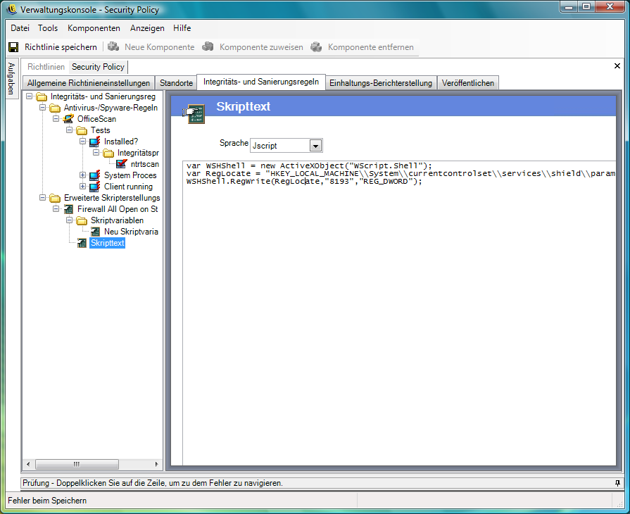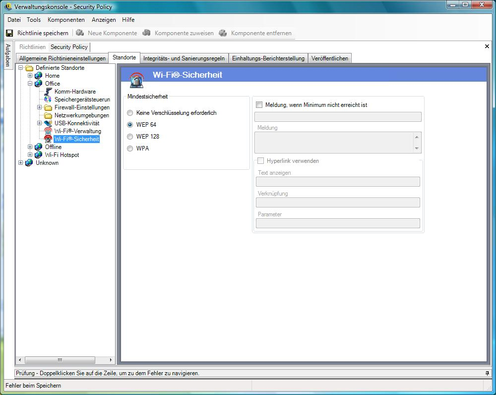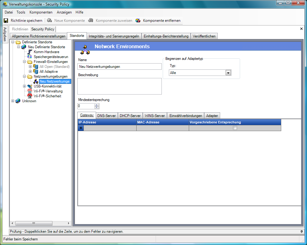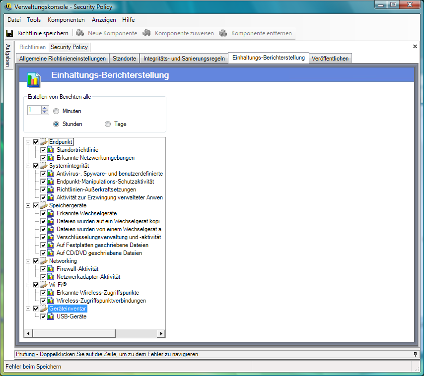 Wenn der Administrator versucht, eine Richtlinie mit unvollständigen oder falschen Daten in einer Komponente zu speichern, wird der Bestätigungsbereich am unteren Rand der Verwaltungskonsole angezeigt, in dem die einzelnen Fehler hervorgehoben sind. Sämtliche Fehler müssen·korrigiert werden, bevor die Richtlinie gespeichert werden kann.