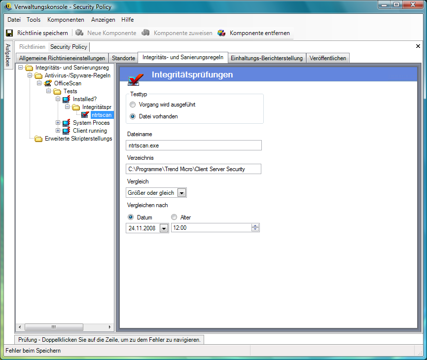 Mithilfe der Prüfungen für die einzelnen Tests wird ermittelt, ob einer oder mehrere der Antivirus-/Spyware-Prozesse ausgeführt werden bzw. ob essenzielle Dateien vorhanden sind. Mindestens eine Prüfung muss definiert werden, damit ein Integritätstest ausgeführt werden kann.
