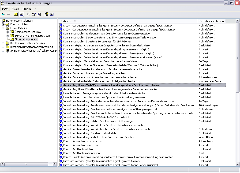 HINWEIS:Wenn Sie CD-ROM-Laufwerke bzw. Diskettenlaufwerke für eine Gruppe von Endpunkten auf "Nur Lesen" einstellen möchten, muss in den lokalen Sicherheitseinstellungen (die durch ein Verzeichnisdienst-Gruppenrichtlinienobjekt übergeben wurden) sowohl für als auch für die Option "Deaktiviert" festgelegt sein. Um dies sicherzustellen, öffnen Sie entweder das Gruppenrichtlinienobjekt oder sehen in der Systemsteuerung unter "Verwaltung" nach. Wählen Sie die Optionsfolge "Lokale Sicherheitseinstellungen" - "Sicherheitsoptionen" und vergewissern Sie sich, dass beide Geräte deaktiviert sind. "Deaktiviert" ist der Standardwert.