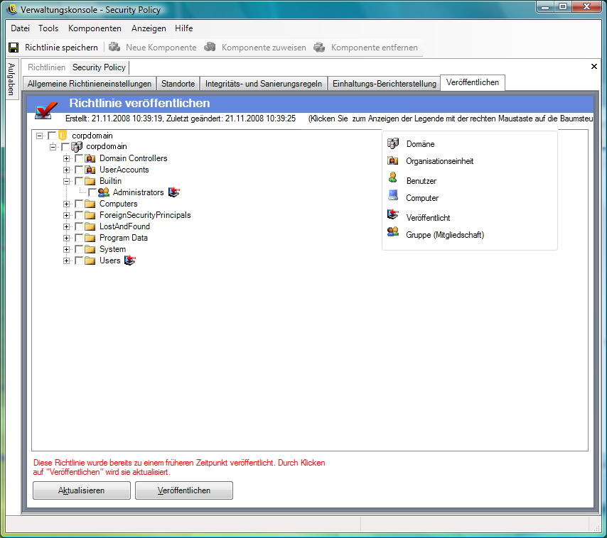angezeigt. Wenn ein Benutzer/eine Gruppe die Richtlinie bereits erhalten hat, wird neben den Einträgen im Verzeichnisbaum das Symbol