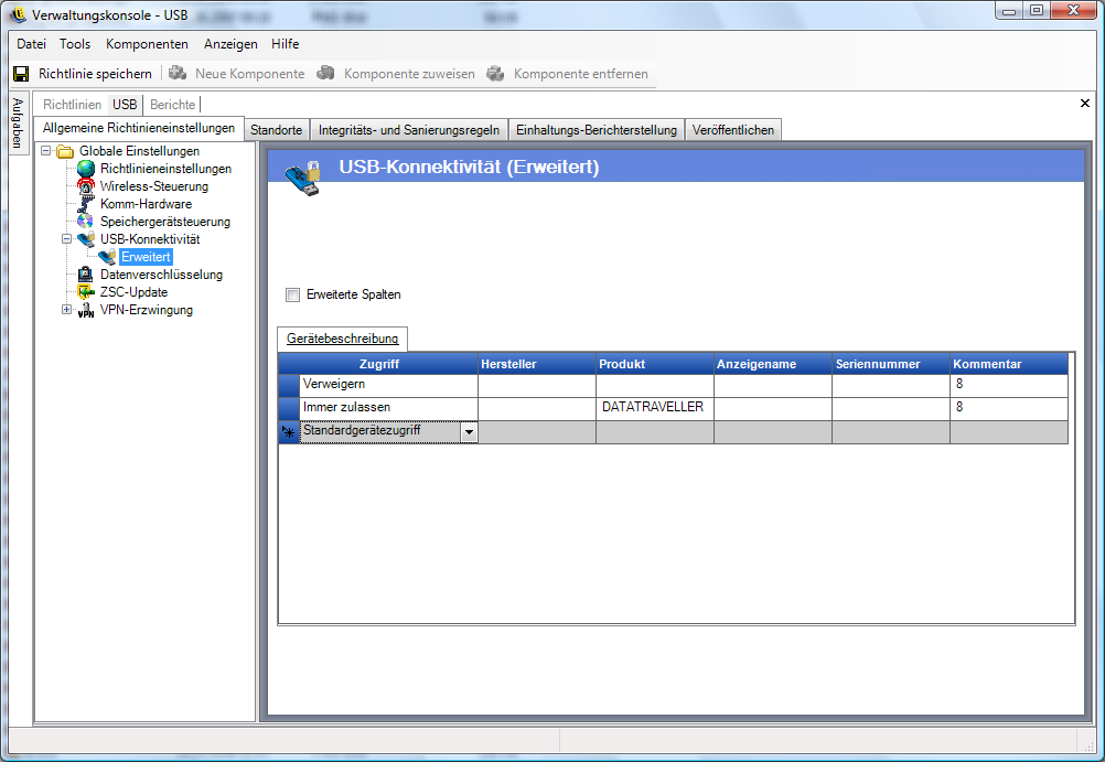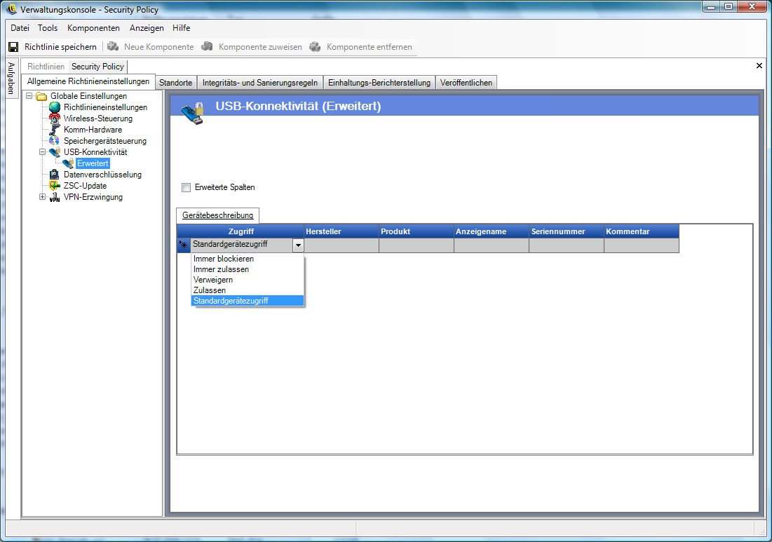 Sämtliche Geräte, die über den USB-BUS eine Verbindung aufbauen, können nach der Richtlinie zugelassen oder verweigert werden. Diese Geräte können aus dem USB-Gerätinventarbericht per Absuche in die Richtlinie übernommen werden; eine weitere Möglichkeit ist die Absuche aller Geräte, die derzeit mit einem Computer verbunden sind. Diese Geräte können, basierend auf Hersteller, Produktname, Seriennummer, Typ usw., gefiltert werden. Zu Supportzwecken kann der Administrator die Richtlinie so konfigurieren, dass ein Satz Geräte akzeptiert wird, entweder nach Herstellertyp (Beispiel: alle HP-Geräte sind zulässig) oder nach Produkttyp (alle USB-Eingabegeräte (Maus und Tastatur) sind zulässig). Zudem können einzelne Geräte erlaubt werden, um zu verhindern, dass nicht unterstützte Geräte Bestandteil des Netzwerks werden (Beispiel: mit Ausnahme dieses Druckers sind keine Drucker zulässig).