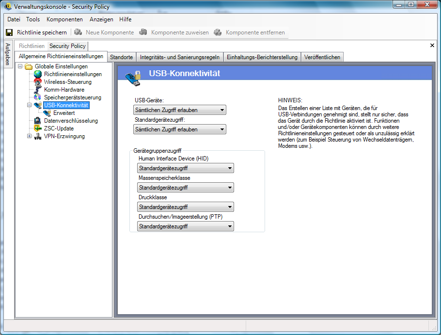 USB-Geräte: Der ZENworks Security Client meldet alle erkannten USB-Geräte im System.