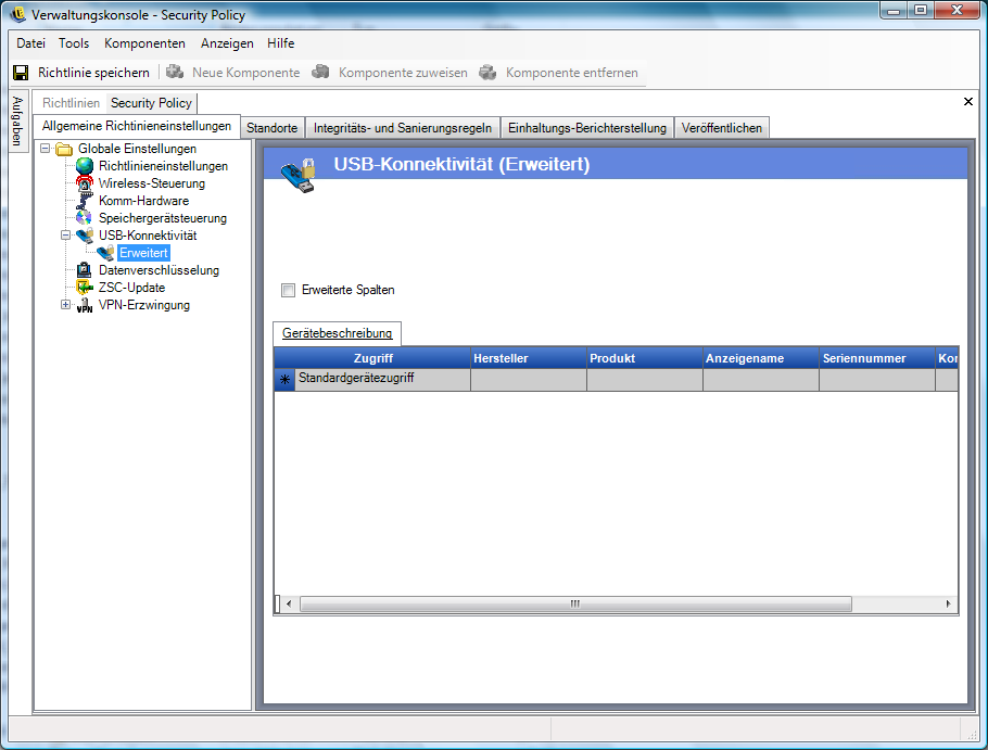 Zum Zugriff auf die erweiterten Optionen für USB-Konnektivität klicken Sie auf das Pluszeichen neben im Baum und anschließend auf . Sie können den USB-Geräteauditbericht dazu verwenden, alle Informationen abzurufen, die Sie potenziell auf der Seite "USB-Konnektivitätssteuerung – Erweitert" verwenden können.