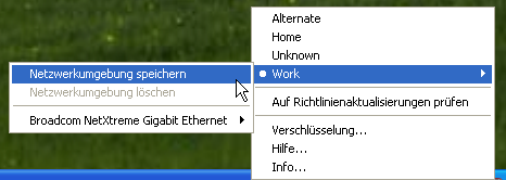 Eine Netzwerkumgebung muss entweder in der Sicherheitsrichtlinie vorgegeben oder vom Endbenutzer gespeichert sein, bevor der Endpoint Security Client 3.5 automatisch den Standort wechseln kann. Beim Speichern einer Netzwerkumgebung werden die Netzwerkparameter für den aktuellen Standort gespeichert, und der Endpoint Security Client 3.5 kann automatisch zu diesem Standort wechseln, wenn der Benutzer das nächste Mal die Netzwerkumgebung verwendet. Beim Anwenden in einer Wi-Fi-Netzwerkumgebung führt der Endpoint Security Client 3.5 ein LockOn™ auf den einzelnen ausgewählten Zugriffspunkt aus.