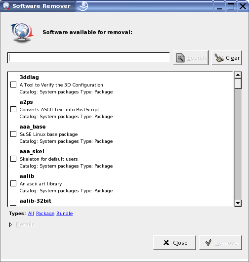 Wählen Sie die zu entfernende Software aus. Klicken Sie auf den Software-Typ, um die Liste zu filtern: oder . Klicken Sie auf , um genauere Informationen zur ausgewählten Software anzuzeigen.