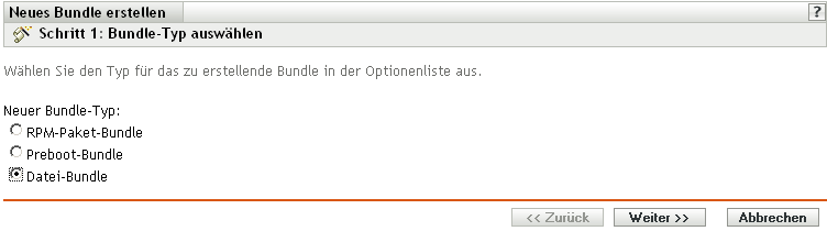 Mithilfe des ZENworks-Kontrollzentrums oder des ZLMAN-Kommandozeilenprogramms können Sie Bundles erstellen. Die folgende Vorgehensweise erklärt, wie ein Datei-Bundle mithilfe des ZENworks-Kontrollzentrums erstellt wird. Wenn Sie das Kommandozeilenprogramm ZLMAN bevorzugen, erhalten sie weitere Informationen dazu im Abschnitt Bundle-Befehle